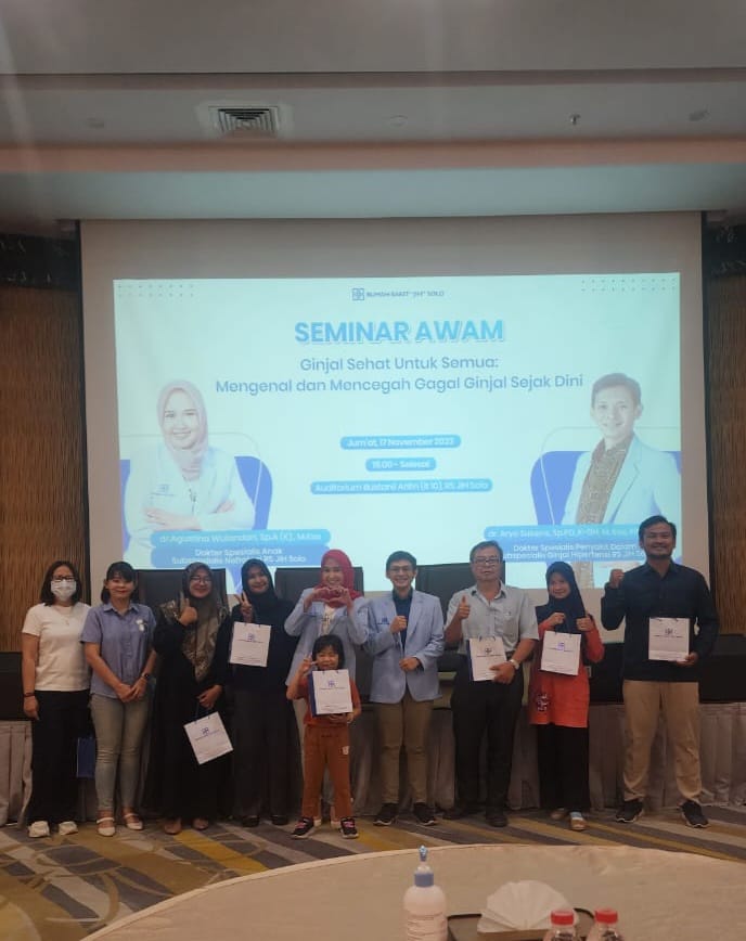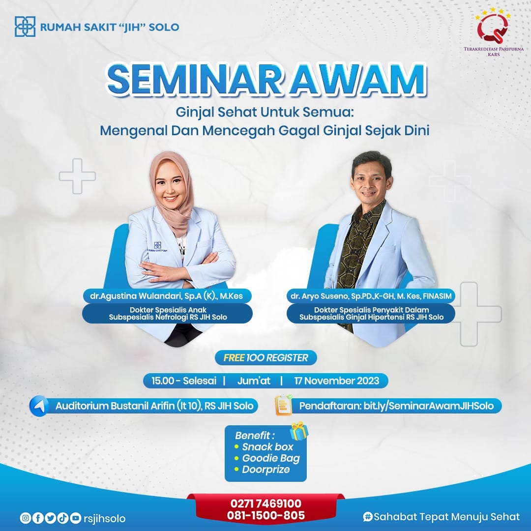 Seminar Awam yang diadakan dalam rangka Hari Kesehatan Nasional 2023 dengan tema Ginjal Sehat untuk Semua : Mengenal dan Mencegah Gagal Ginjal Sejak Dini. Kegiatan dilaksanakan pada hari Jumat tanggal 17 November 2023 pukul 15.00 - selesai bertempat di Auditorium Bustanil Arifin (lt. 10) RS JIH Solo. Dengan narasumber dr. Agustina Wulandari, Sp.A(K), M. Kes yang merupakan Dokter Spesialis Anak Subspesialis Nefrologi dan dr. Aryo Suseno, Sp.PD,K-GH, M.Kes, FINASIM yang merupakan Dokter Spesialis Penyakit Dalam Subspesialis Ginjal Hipertensi.