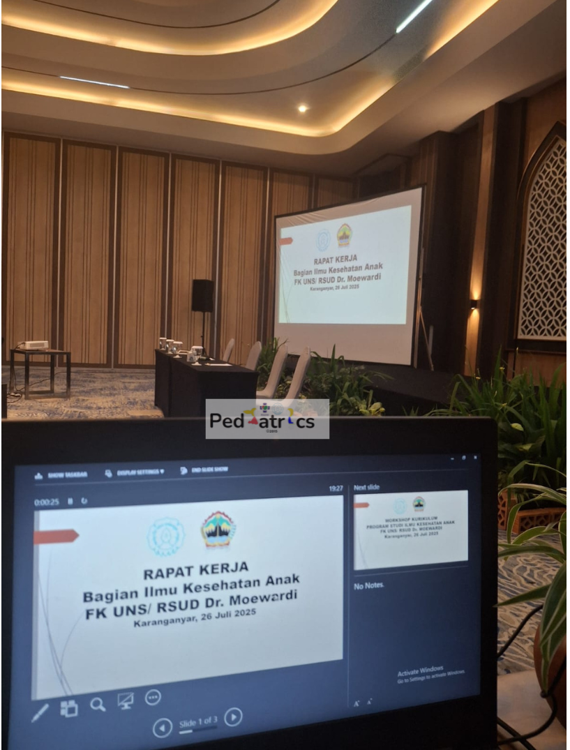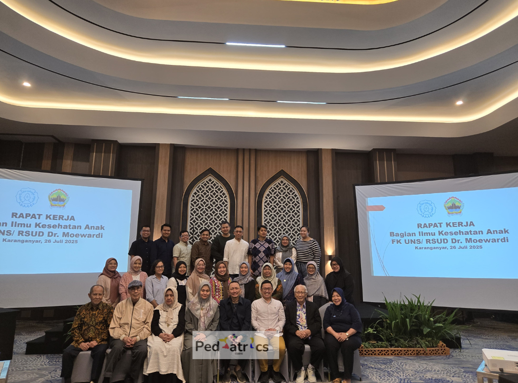 Kegiatan rapat kerja (RAKER) Prodi Ilmu Kesehatan Anak yang dilaksanakan oleh seluruh staf Pengajar dan Supporting Staf Prodi Ilmu Kesehatan Anak FK UNS pada 26 - 27 Juli 2025 di Hotel Anaya Azana Boutique Tawangmangu. Agenda rapat membahas tentang masalah prodi mulai dari SDM, Coas dan masalah PPDS serta solusi yang bisa dilakukan. Kegiatan rapat dipimpin oleh Kepala Bagian Ilmu Kesehatan Anak FK UNS : Dr. dr. Fadhilah Tia Nur, Sp. A, Subsp. Neuro(K), M.Kes dan Ketua Program Studi Ilmu Kesehatan Anak FK UNS : Dr. dr. Hari Wahyu Nugroho, Sp.A, Subsp. TKPS(K), M.Kes.