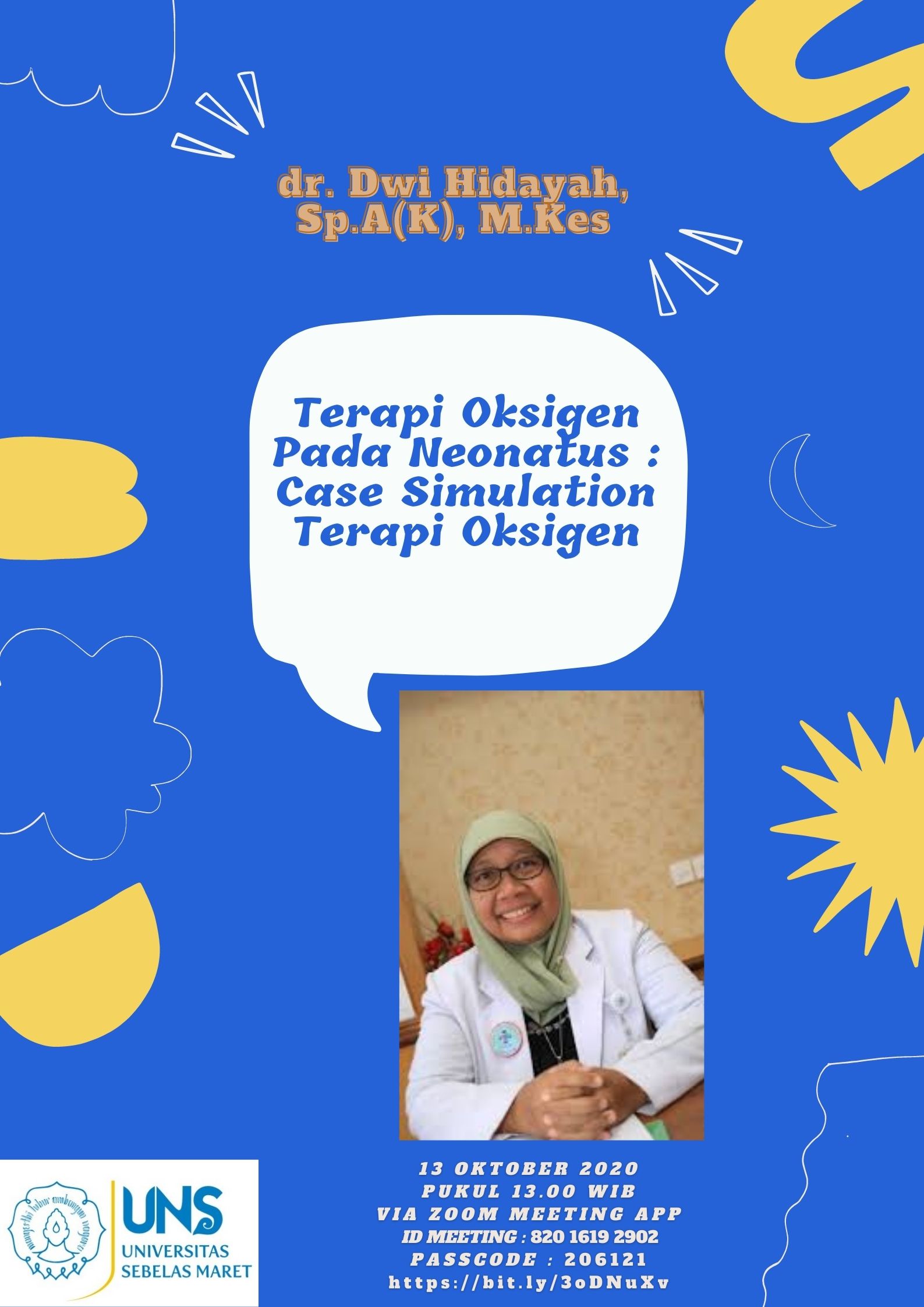 Prodi Ilmu Kesehatan Anak menyelenggarakan Workshop "Terapi Oksigen Pada Neonatus : Case Simulation Terapi Oksigen" yang dilaksanakan pada tanggal 13 Oktober 2020 via daring menggunakan aplikasi zoom meeting. Pembicara workshop adalah dr. Dwi Hidayah, Sp.A(K), M. Kes yang merupakan dokter spesialis anak dan staf pengajar sub divisi Neonatologi. Workshop diikuti oleh PPDS Prodi Ilmu Kesehatan Anak.